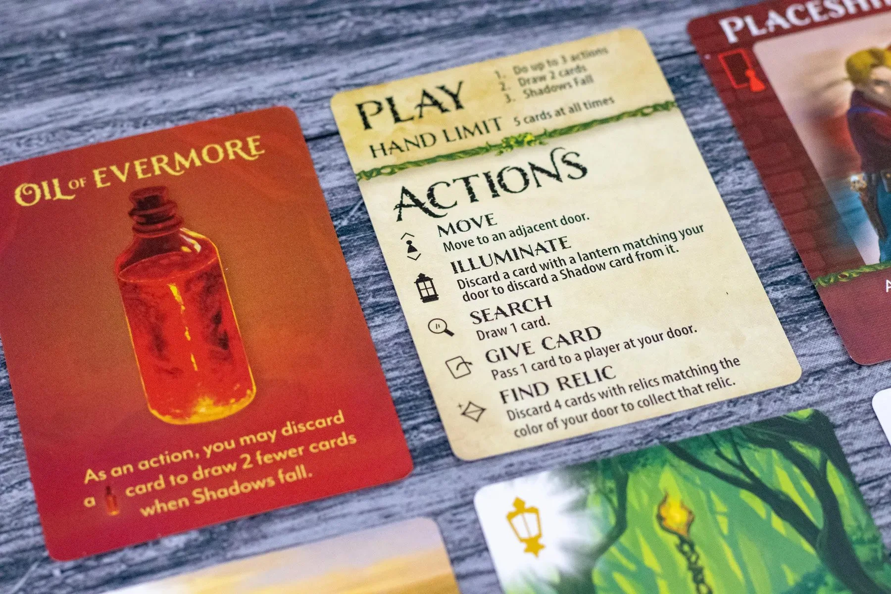 I ran with it. The shadowy threats could be dispelled by illuminating them. The doors could contain the treasures the adventures needed – but they could be closed off if the players weren't careful. I experimented with the door card layouts and came up with the idea of stacking them into a tower. That opened up the idea of a lighthouse with a magical beacon on top. This in turn led me to change the treasures into the relics needed to light the beacon to dispel the shadows forever.